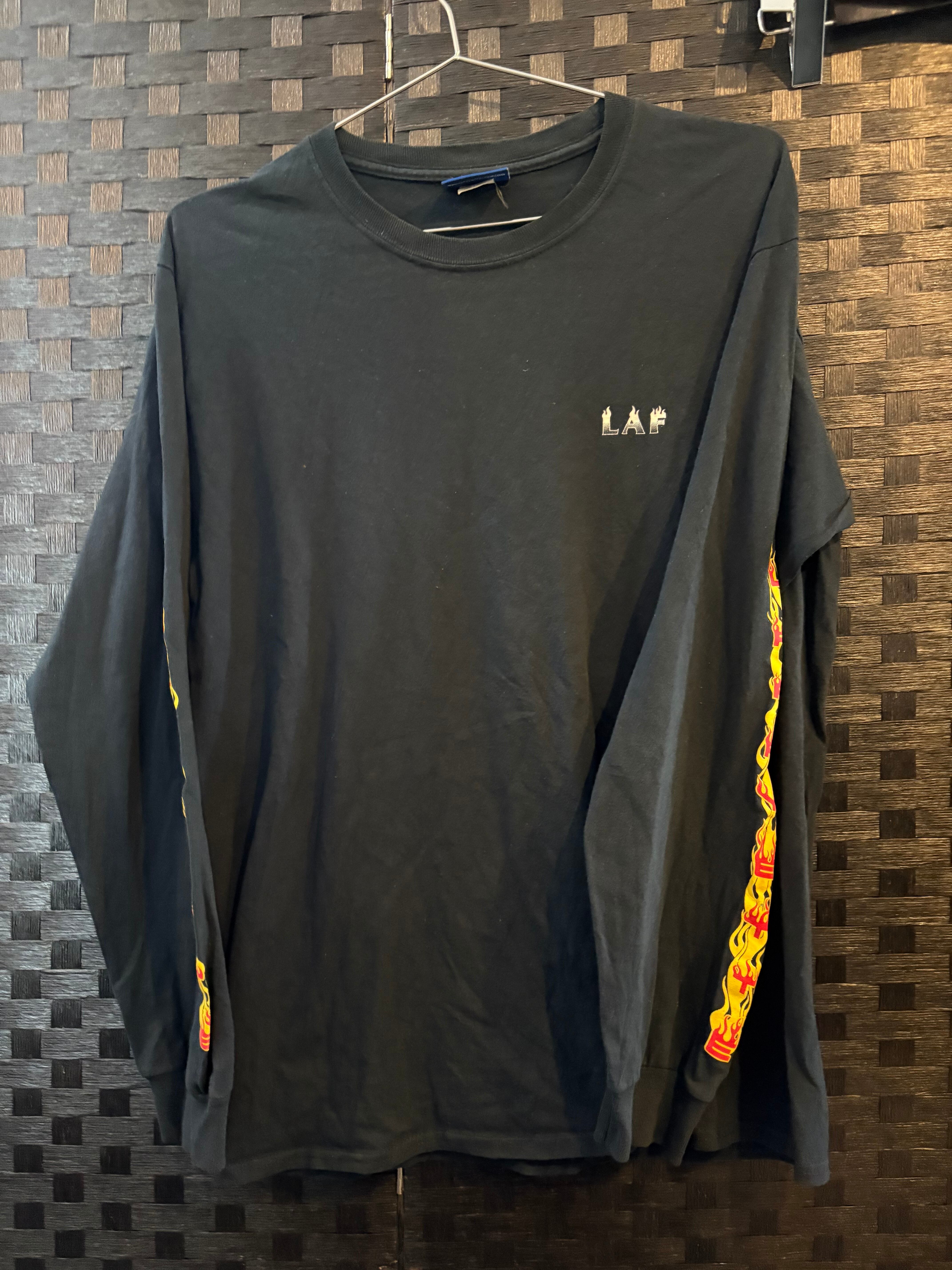 ブラックの長袖カットソー、LAPロゴと炎のグラフィックが特徴。