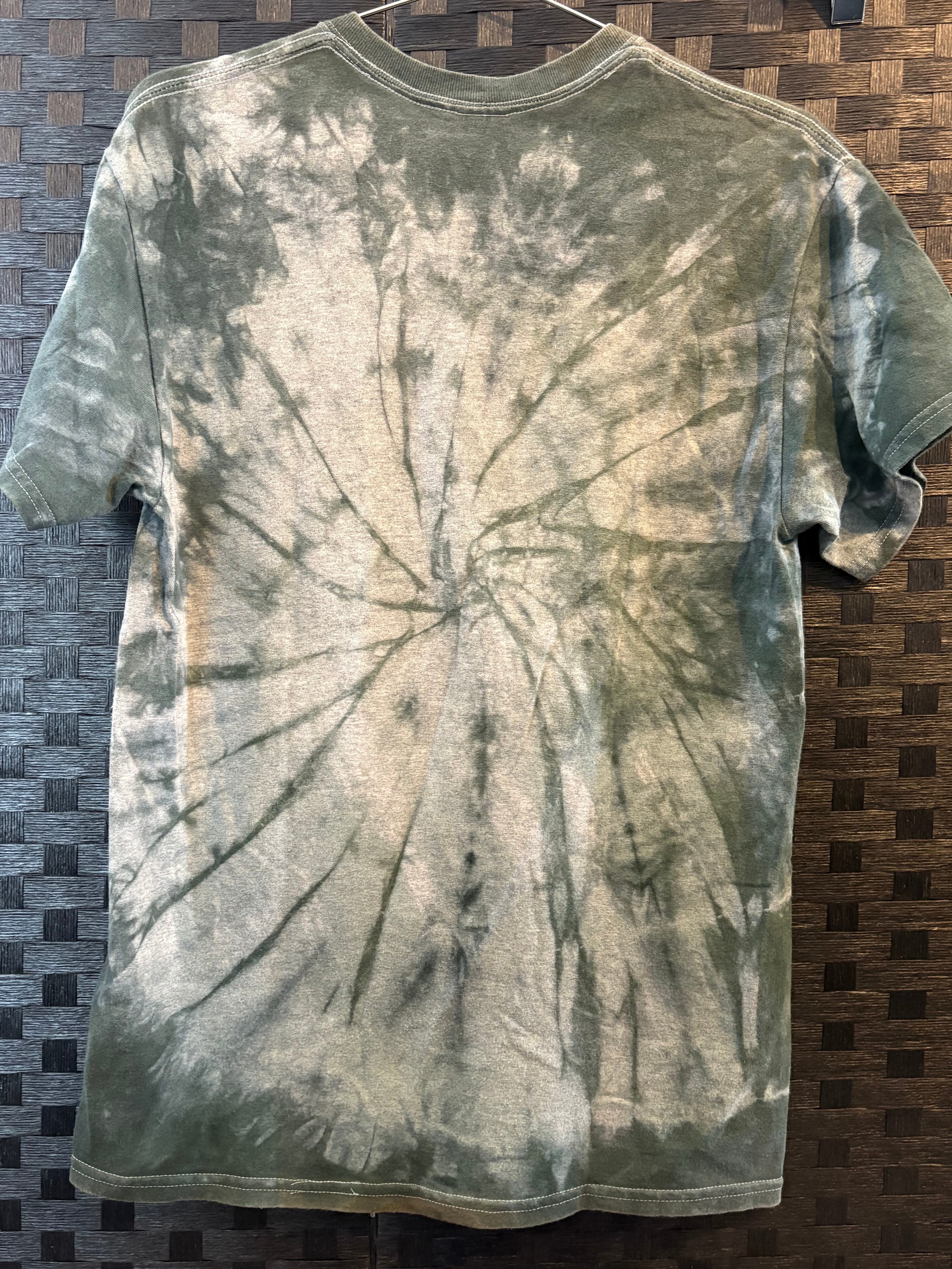 タイダイ柄のGILDAN製Tシャツ、グレーとグリーンの配色が特徴。