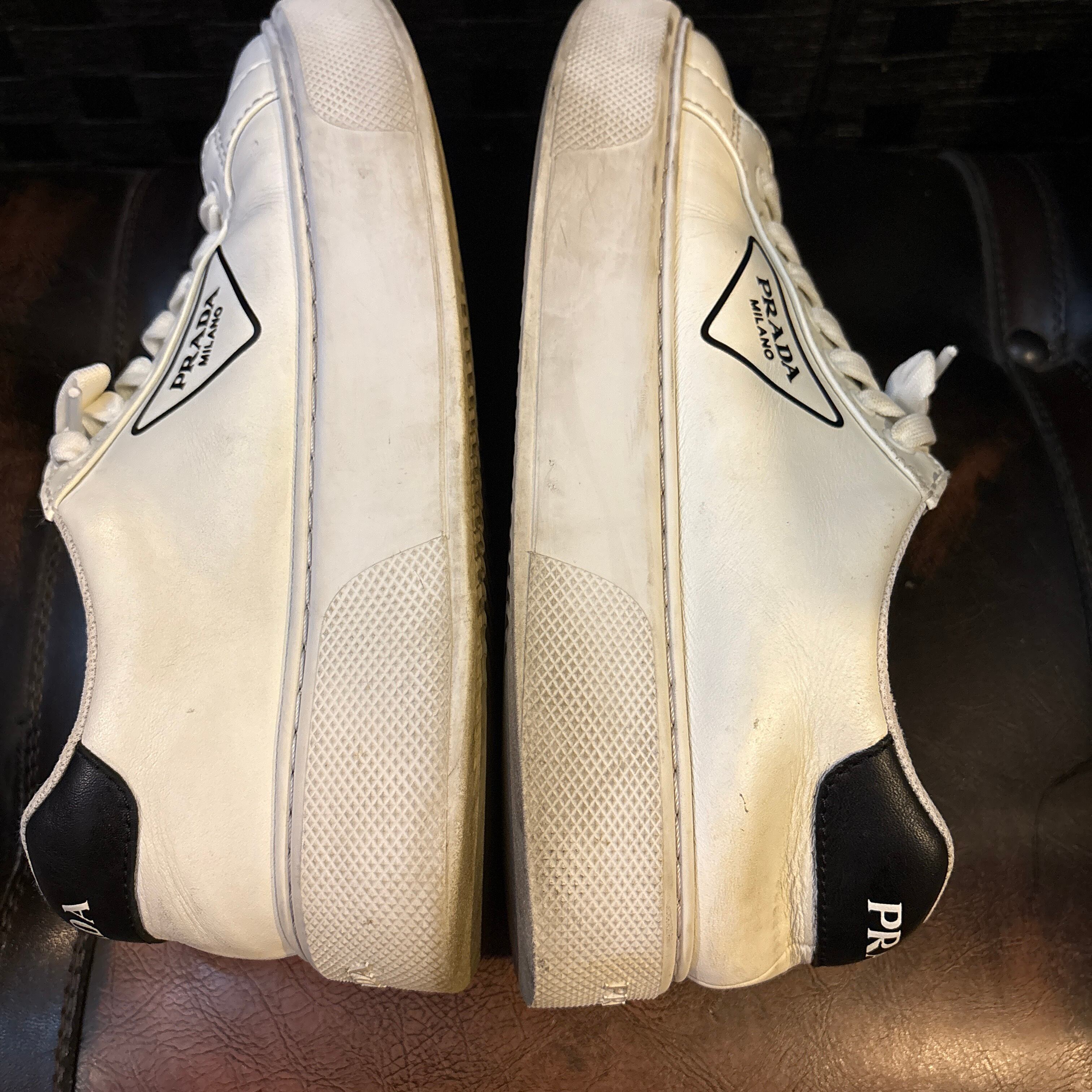 ホワイトレザーにPRADAのロゴが施されたスタイリッシュなスニーカー。