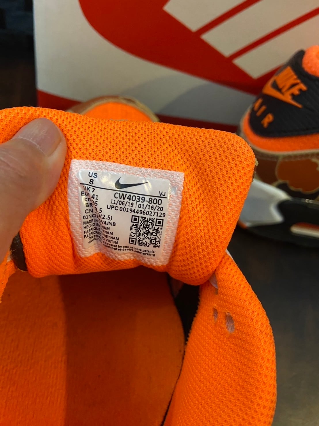 オレンジとカモフラージュのデザインが特徴のNike Air Max 90。