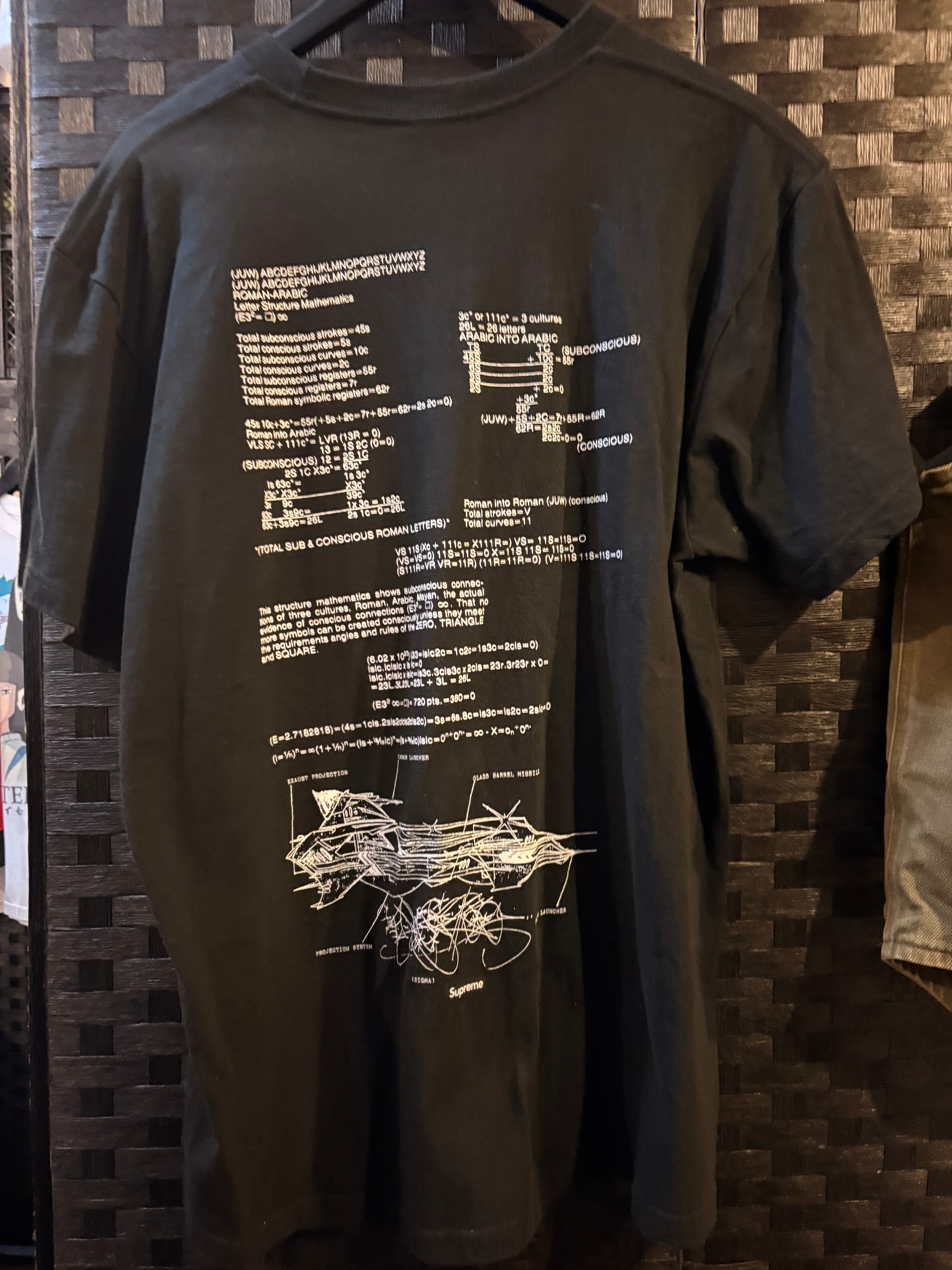 フロントにアートプリント、バックにテキストと図面が施されたSupremeのTシャツ。