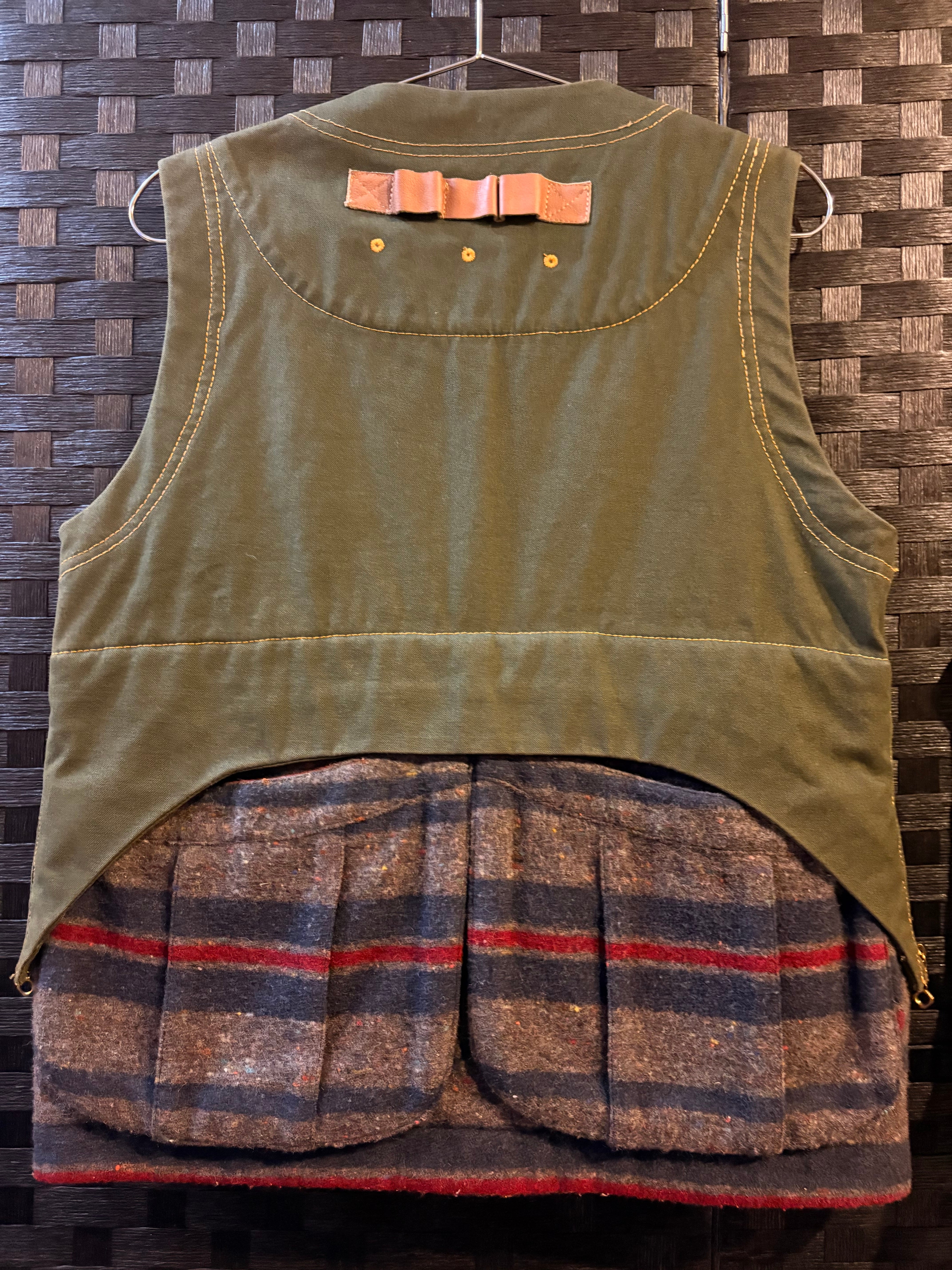 オリーブグリーンのノータルデザインベスト、ストライプ柄の裏地とボタン付きポケットが特徴。