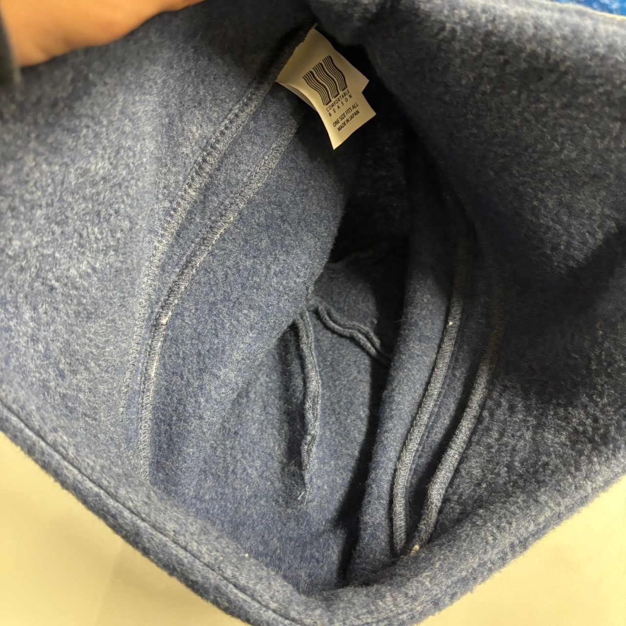 青色のフリース素材で作られたワンサイズの帽子。