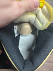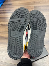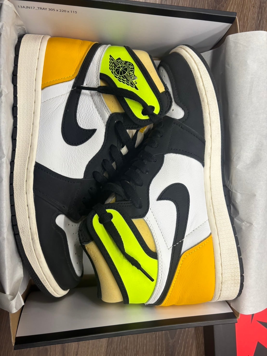 エアジョーダン1のハイカットスニーカー、ブラックとイエローのコントラストが特徴。