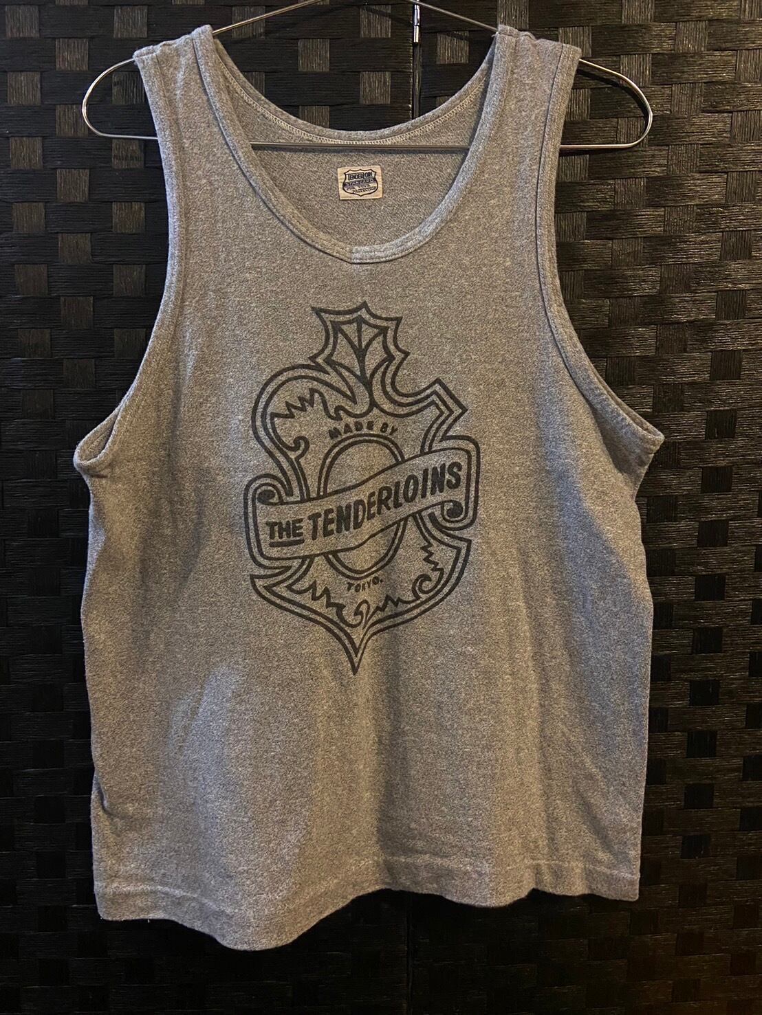 グレーのタンクトップにTHE TENDERLOINSのロゴが施されたデザイン。